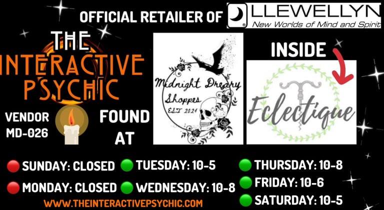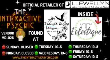 The Interactive Psychic is proud to offer its curated collection of metaphysical tools, educational resources, and spiritual wellness products in person at Midnight Dreary Shoppes, located within the beautifully eclectic walls of Eclectique in Latrobe, Pennsylvania.